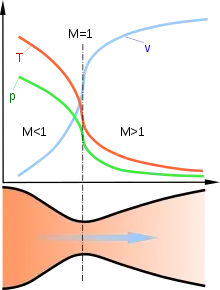 نمودار یک نازل همگرا-واگرا (دلاوال) که تغییرات سرعت را به همراه فشار و دما نشان میدهد.
