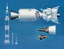 آگاهییافتن جامعه ایالات متحده از پیشگامی شوروی در رقابت فضایی و فرستادن نخستین انسان به فضا، رئیسجمهور جان اف. کندی را تشویق کرد تا در ۲۵ مه ۱۹۶۱ درخواستی را به کنگره ارائه داده و دولت فدرال را ملزم به فرود یک انسان روی ماه تا پایان دهه ۱۹۶۰ میلادی کند. این تلاشها، در نهایت منجر به برنامه فضایی آپولو شد.[81] آپولو یکی از پرهزینهترین برنامههای علمی تاریخ آمریکا است. در دهه ۱۹۶۰، این برنامه بیش از ۲۰ میلیارد دلار هزینه داشت[82] که با احتساب تورم، تقریباً برابر ۲۱۸ میلیارد دلار امروز است.[83] برای مقایسه، هزینه پروژه منهتن با احتساب تورم تقریباً برابر ۲۷٫۸ میلیارد دلار است.[83][84] راکت ساترن وسیله پرتاب پروژه آپولو بود که نسبت به راکتهای پیشین، اندازه بسیار بزرگتری داشت.[85] فضاپیمای مورد استفاده هم بزرگتر بود و از دو قسمت اصلی سفینه فرماندهی و خدمات آپولو و ماهنشین آپولو تشکیلشده بود. قرار بود ماهنشین روی ماه بماند و سفینه فرماندهی، تنها بخشی بود که در نهایت به زمین برمیگشت.[86][persian-alpha 5]