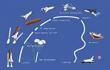 شاتل فضایی از سه جزء یا بخش ساخته شده بود: دو موشک سوخت جامد برای پرتاب شدن شاتل، مخزن سوخت خارجی که سوخت را برای پرتاب شدن شاتل حمل میکرد و مدارگرد که فضانوردان و بارها را حمل میکرد. مخزن سوخت، که از خود مدارگرد بزرگتر است، تنها بخش اصلی بود که نمیشد آن را مورد استفاده مجدد قرار داد. مدارگرد شامل سه موتور بود که پشت بدنهٔ شاتل قرار داشت و پهنای هر موتور ۴/۳ متر (۱۴ فوت)، قطر آن ۳/۲ متر (۷/۵ فوت) و وزن آن حدود ۳٬۰۳۹ (۶٬۷۰۰ پوند) بود. این موتورها هیدروژن و اکسیژن مایع را میسوزاندند که این سوخت به نسبت ۶ به ۱ در مخزن خارجی ذخیره میشد.[129] شاتلها میتوانستند تا حداکثر ۲۴٬۴۰۰ کیلوگرم (۵۳٬۷۹۳ پوند) بار را حمل کنند[130] و قادر بودند در ارتفاع ۱۸۵–۶۴۳ کیلومتری (۱۱۵–۴۰۰ مایل) قرار بگیرند.[131] مأموریتها در ۵ تا ۱۷ روز انجام میگرفت و خدمه هر مأموریت بین ۲ تا ۸ فضانورد بود.[131]