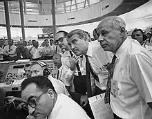 ناسا در همان سال تأسیس شد و برنامه نیروی هوایی هم با انتقال به ناسا، «پروژه مرکوری» نام گرفت. هفت فضانورد از میان نامزدان از نیروی دریایی، نیروی هوایی و تفنگداران انتخاب شدند. پروازهای فضایی مرکوری بهطور کلی شامل دو دسته بود: «فضاپیماهای رادستون» برای پروازهای زیر مداری و «فضاپیماهای اطلس» برای پروازهای مداری طراحی شده بودند.[55] در ۵ مه ۱۹۶۱، آلن شپارد در مأموریت مرکوری-رادستون ۳ و در مدت پرواز ۱۵ دقیقه پرواز بالستیک، به عنوان نخستین آمریکایی به فضا رفت.[53][56][57] جان گلن، نخستین شخص آمریکایی بود که به مدار زمین رسید. این مأموریت، با نام مرکوری-اطلس ۶، در ۲۰ فوریه ۱۹۶۲ و با اطلس الوی-۳بی انجام شد و گلن توانست در آن، سه بار مدار زمین را طی کند.[58][59] پس از این مأموریت، سه پرواز مداری دیگر هم انجام شدند که مأموریت مرکوری-اطلس ۹ در ۱۵–۱۶ مه ۱۹۶۳ و با همراهی گوردون کوپر و ۲۲ بار طی کردن مدار زمین، بیشترین رکورد آنها محسوب میشود.[60] کاترین جانسون[persian-alpha 2]، مری جکسون[persian-alpha 3] و دوروثی وان،[persian-alpha 4] سه اپراتوری بودند که محاسبات مسیریابی را در دوران رقابت فضایی انجام میدادند.[61][62][63] کاترین جانسون به دلیل انجام محاسبات مسیریابی برای مأموریت جان گلن در سال ۱۹۶۲، که در آن، همزمان با رایانه، همان محاسبات را روی کاغذ هم مینوشت، شناخته شدهاست.[61]