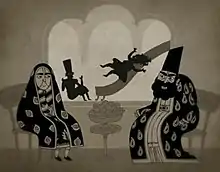 ![]() میرزا آقاخان نوری و مهدعلیا در حال صحبت کردن. در پشت صحنه، ناصرالدین شاه در حال گرفتن یکی از همسرانش از سرسره ناصری. | |