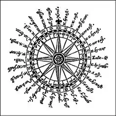 | ۲۳ | West-southwest | WSW | Ponente-Libeccio | ۲۴۱٫۸۸° | ۲۴۷٫۵۰° | ۲۵۳٫۱۲° |