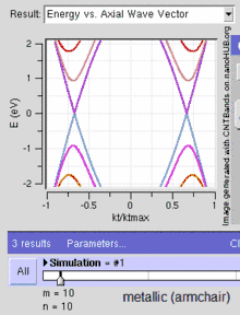 بر خلاف گرافن که یکنیمهفلز دوبعدی است، نانولولههای کربنی یا فلزی یا نیمهرسانا در امتداد محور لوله هستند. برای یک نانولوله (n,m)، اگر n = m باشد، نانولوله فلزی است. اگر n - m مضربی از ۳ و n ≠ m و nm ≠ ۰ باشد، نانولوله شبهفلزی است و شکاف باند بسیار کوچکی دارد. در غیر این صورت نانولوله یک نیمهرسانای متوسط است.[18] بنابراین، همه نانولولههای (n = m) فلزی هستند و نانولولههای (۶٬۴)، (۹٬۱) و غیره نیمه رسانا هستند.[19] نانولولههای کربنی نیمه فلزی نیستند زیرا نقطه منحط (نقطهای که در آن باند π [اتصال] با باند * π [ضد اتصال] به هم میرسند، که در آن انرژی به صفر میرسد) کمی از نقطه K در منطقه بریلو تغییر مکان دادهاست. این تغییر مکان ناشی از انحنای سطح لوله است.