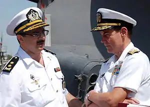 کوین کاسگریف از ناوگان پنجم در حال دیدار با شاهین سلطانف، فرمانده نیروی دریایی آذربایجان در باکو