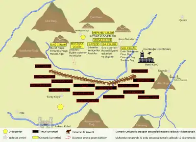 در آرایش سپاه تیمور، خود او به فرماندهی مرکز سپاه و پسرانش میرانشاه و شاهرخ به ترتیب به فرماندهی سمتهای راست و چپ سپاه و نوهها در گروه پیشاهنگان قرار داشتند.[4]
