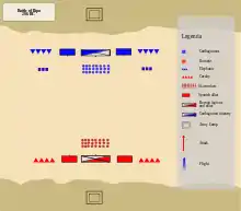 شیپیو در مرکز آرایش نظامی ارتش خود، لژیونها و در جناحین آنان، اسپانیولیها را قرار داد، در جناحین کل سپاه نیز سوارهنظام را جای داد؛ در همانحال ولیتس[یادداشت 9]همچون همیشه در جلوی لژیونها جای گرفته بودند. کارتاژیها نیز همان آرایش را اتخاذ کرده بودند، بدین معنا که پیادهنظام سنگیناسلحه متشکل از آفریقاییها در مرکز واقع شده (و طبیعتاً قرار بود با لژیونها رویارو گردد)، و اسپانیولیها و سوارهنظام در جناحین جای گرفتند (که آنان نیز قرار بود بهترتیب با اسپانیولیهای روم و سواران رومی بجنگند)، پیادهنظام سبک نیز در مرکز و روبروی آفریقاییها، و فیلهای جنگی (که رومیان از آن بیبهره بودند) نیز در روبروی سوارهنظام قرار گرفته بودند (به نقشه اول نگاه کنید). امّا پساز آنکه شیپیو مطمئن شد کارتاژیها نیز چنین آرایشی اتخاذ کردهاند، دستبه حیلهای زده و لژیونها (پیادهنظام سنگین) را با اسپانیولیها جایگزین نمود؛ بدینمعنا که لژیونها را در جناحین و اسپانیولیها را در مرکز سپاه قرار داد (به نقشه دوم نگاه کنید). ولیتس نیز میان لژیونها و سوارهنظام واقع شدند و مأموریت آنان مقابله با فیلهای دشمن بود.