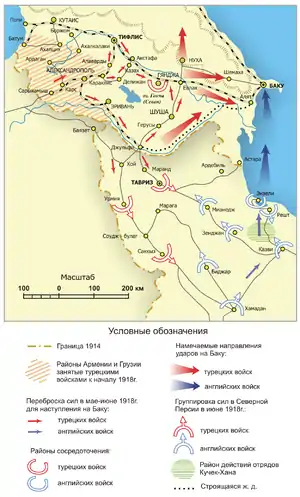 انور پاشا به فرمانده نیروهای عثمانی نوری پاشا دستور داد به منظور دست یافتن به پیوستگی و یکدستی اقلیمی جمهوری آذربایجان را از روسها و ارمنیان پاک کند.[13] در پانزده سپتامبر باکو سقوط کرد. ارتش عثمانی تحت فرماندهی نوری پاشا، برادر زاده (اسماعیل انور) قرار داشت. انور از سازمان دهندگان نسلکشی ارمنیان بود. این نیروها در ۱۵ سپتامبر ۱۹۱۸ وارد شهر باکو شدند و در پی آن به مدت سه روز پیاپی قتلعام ارمنیهای این شهر به مورد اجرا گذاشته شد که منجر به کشتار حدود سی هزار نفر از ارمنیان گردید.[14][15][16][17]