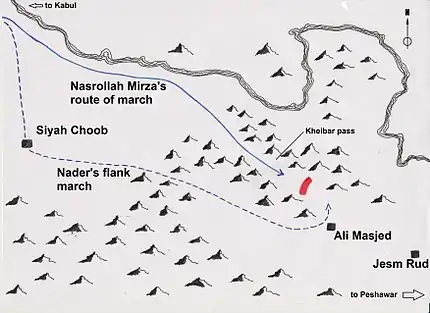 ![]() یک نقشه از جنگ تنگه خیبر، پیشروی جناح نادر در ۸۰ کیلومتر را نشان میدهد | |||||||||
