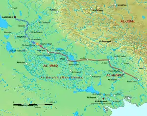 ![]() نقشهٔ محل وقوع نبرد، و نیز مسیرهای تسخیرشده توسط صفاریان (قرمز) و نیروهای عباسی (آبی) | |||||||||||