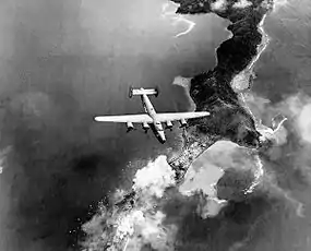 ![]() یک بمب افکن نیروهای هوایی ایالات متحده، که بر فراز انفجارها در شبه جزیره سالامائوآ، جایی که بندر واقع شدهاست، پرواز میکند. | |||||||