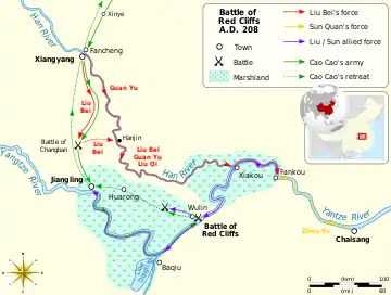 در اواخر قرن دوم میلادی امپراتوری هان به شدت دچار ضعف شده بود. از سال ۱۸۹ امپراتور دیگر قدرتی نداشت و بیشتر یک مقام تشریفاتی بود تا یک فرمانروا. در این دوران ژنرالهای وی به صورت خودمختار بر سرزمینهای خود حکومت میکردند. یکی از این ژنرالهای قدرتمند، کائو کائو بود. او در سال ۲۰۷ مناطق شمالی چین را متحد کرد و به سادگی کنترل تمامی این مناطق را به دست گرفت. در زمستان همان سال کائو کائو به ووهوآن لشکرکشی کرد و توانست امنیت مرزهای مناطق شمالی را تأمین کند. نهایتاً پس از بازگشت وی در سال ۲۰۸ به عنوان صدراعظم امپراتوری هان انتخاب شد و کمی پس از این انتصاب و در پاییز سال ۲۰۸ او لشکرکشی خود را به سرزمینهای جنوبی آغاز کرد. او در ابتدا به ایالت جینگ لشکر کشید و لیو بی، فرمانروای ایالت جینگ را در نبرد چانگ بن شکست داد و بر پایگاه دریایی جیانگ لینگ مسلط شد.