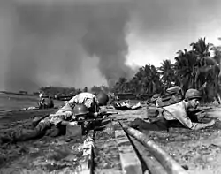 ![]() سربازان آمریکایی هنگام پیشروی در ساحل تالیسای، جزیره سبو، ۲۶ مارس ۱۹۴۵. "ایالات متحده بایگانی ملی» | |||||||