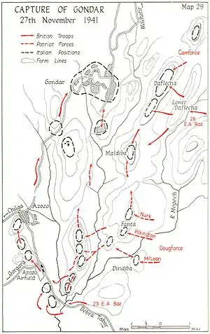 در تاریخ ۲۳ نوامبر هنگامی که نیروهای متفقین گردنهها را گرفتند کنترل ارتفاعات مشرف به شهر گوندار را به دست آوردند. پادگان گوندار به دلیل اینکه بسیاری از آسکاریهایی که حقوقشان توسط ایتالیاییها پرداخت نشده بود، رها کرده بودند بهطور جدی تهی گشته بود. حمله نهایی در گوندار که ستاد گوگلیلمو ناسی در آنجا مستقر بود در ۵:۳۰ سحرگاه ۲۷ نوامبر آغاز شد. هدف نخست فرودگاه آزوزو بود؛ که در ظهر همان روز تسخیر شد و نیروهای مشترکالمنافع به قلعه فاسیلایدس رسیدند. در ساعت ۴:۳۰ پس از ظهر در حالی که هنگ زره پوش کنیا در حومه شهر نفوذ کرده بود، ژنرال ناسی آخرین پیام خود را به ایتالیا فرستاد، وی توضیح داد که تیپ ذخیره که در جبهه جنوب مستقر شده بود، قادر به جلوگیری از حمله نشده و نیروهای دشمن از سیم خاردار گذشته و دشمن با وسایل نقلیه زرهپوش وارد شهر شدهاند. ناسی به زودی پس از ارسال نامه تسلیم شد. برخی پایگاههای ایتالیایی تا ۳۰ نوامبر مبارزه کردند، و در نهایت جنگ به پایان رسید.