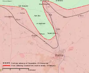 ![]() نقشه خطوط مقدم نبرد ۲۰۱۲ حمات تحت کنترل دولت سوریه تحت کنترل شورشیان سوریه | |||||||