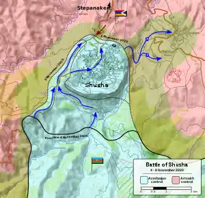 نیروهای ویژه آذربایجانی با پشتیبانی از آتش توپخانه،[54] و صعود از صخرههای سنگی شهر، در ۷ نوامبر وارد شوشا شدند.[48] آنها به سرعت ارمنیها را از شهر بیرون کردند و در ۸ نوامبر، الهام علی اف، رئیسجمهوری آذربایجان، اظهار داشت که نیروهای آذربایجانی کنترل شوشا را به دست گرفتند. ارمنستان این خبر را تکذیب کرد.[55] روز بعد، وزارت دفاع آذربایجان با انتشار تصویری از شهر ، کنترل کامل آذربایجان را تأیید کرد. [39] در همان روز، دفتر ریاست جمهوری آرتساخ تأیید کرد که کنترل شوشا را از دست دادهاست[56][57] اگرچه بعداً با اظهارات نخستوزیر ارمنستان نیکول پاشینیان،[58] و وزارت دفاع ارمنستان مخالفت شد.[59] پس از امضای یک توافق آتشبس، رئیسجمهور آرتساخ، آرایک هاروتیونیان تصریح کرد که آرتساخ کنترل شهرستان شوشا را در ۷ نوامبر از دست داده بود،[60] و پاشینیان به از دست دادن شهر اعتراف کرد.[61] به دلیل مزیت استراتژیک شهر،[62] تصرف شوشا با تسلیم ارمنستان و اعلام پیروزی آذربایجان، لحظه ای سرنوشت ساز در جنگ شد [39].[63][64][65]