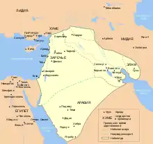 ![]() خطچین قرمز مرزهای امپراتوری بابل را در زمان نبوپیلسر | |||||
