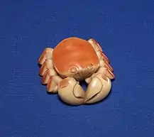 نِتسوکه، خرچنگ از عاج نوکشاخ کلاهخوددار، نوزدهم، رنگآمیزی طبیعی غده - اومیماتسو (umimatsu): گونهای از مرجانهای سیاه با بافت متراکم، حلقههای رشد متحدالمرکز و به رنگ کهربایی مایل به قرمز در ماده سیاه است. به گفته مایکل بیرچ: {ترجمه تحت اللفظی اومیماتسو «کاج دریایی» است، و همچنین در بین مردم به عنوان «مرجان سیاه» توصیف میشود. با این حال، مرجان واقعی یک ماده آهکی سخت است که توسط پولیپهای دریایی برای سکونت ترشح میشود. اومیماتسو، از طرف دیگر کلونی موجودات دریایی کراتینی ضدپاتارین است.} به گفته بوشل، «ترجمه تحت اللفظی… کاجدریایی است… چه به معنای واقعی و چه به صورت مجازی ترجمه غلط اسمی است، زیرا ماده در حقیقت مرجانی است که توسط اسکلت موجودات زنده تشکیل شدهاست. … به رنگ، اومیماتسو، مرجان سیاه، سیاه یا قهوهای مایل به سیاه است که گاهی اوقات رگههایی از قهوهای روشن یا زرد کثیف را نشان میدهد.» بوشل ادامه میدهد: «به عنوان ماده، اومیماتسو برای جمعکنندگان بیشتر از تراشکاران قابلقبول است. تراشکاران پیشرو بهطور طبیعی از این مواد خودداری میکردند. این ماده مستعد ترکخوردگی، خرد شدن یا پوسته شدن بود. تراشکاران میدانند که این مواد برای جزئیات تراشکاری و جلوههای ظریف پرمخاطره است. به دست آوردن قطعات عالی از مرجانهای سیاه دشوار بود.»