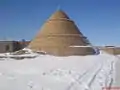 - مخزن آب انبار (نمای کناری): این سرپوش مخروطی مخزن در تابستان به خنک نگه داشتن آب کمک زیادی میکند. قسمت اصلی مخزن در دل زمین قرار دارد و بسیار بزرگ است بهطوریکه ظرفیت آب آن در حدود ۷۲ تانکر ۱۸ هزار لیتری است. به علت پوشیده بودن و تاریکی حاصل از آن و فشار آب این آب به شدت خوش طعم و گوارا و عاری از هرگونه آلودگی است.