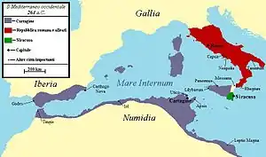 ![]() مدیترانه غربی سال ۲۶۴ قبل از میلاد. روم به رنگ سرخ، کارتاژ ارغوانی و سیراکیوس برنگ سبز. | |||||||||