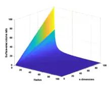 نسبت در حالت n بعدی به کاهش پیدا میکند؛ بنابراین همان رابطهٔ خطی برای سطح و حجم در هر بعد برقرار است: دو برابر کردن شعاع همواره نسبت را نصف میکند.