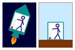 در روندی معکوس ممکن است این انتظار وجود داشته باشد که با مشخص کردن حرکت لخت اجسام از طریق مشاهدهٔ حرکت واقعی و حذف انحرافهای مربوط به نیروهای خارجی (مانند الکترومغناطیس و اصطکاک)، میتوان هندسهٔ فضا و همچنین مختصات زمان را تعریف کرد، اما وقتی پای گرانش به میان میآید این موضوع کمی ابهامآمیز میشود. بر طبق قانون گرانش نیوتن و تأیید آزمایشهای مستقلی مانند آزمایش لورند اوتوو و سایرین، سقوط آزاد جهانشمول است (این قانون همچنین با نام اصل ضعیف همارزی یا قانون جهانی برابری جرم لختی و جرم غیرفعال گرانشی شناخته میشود): مسیر حرکت ذره آزمون در سقوط آزاد تنها به مکان و سرعت اولیه اش بستگی دارد و به هیچیک از ویژگیهای مادیاش وابسته نیست.[17] نسخهای ساده شده از این مفهوم را میتوان در آزمایش آسانسور انیشتین یافت که در تصویر سمت چپ دیده میشود: ناظری که در یک اتاق بسته کوچک قرار گرفته غیرممکن است که تنها با بررسی مسیر سقوط آزاد جسمی مانند یک توپ بتواند بفهمد که آیا محفظه، در حال سکون و در یک میدان گرانشی قرار دارد یا اینکه در فضای آزاد سوار بر موشکی شتابدار است که نیرویی به اندازه گرانش ایجاد میکند.[18]