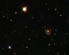 شکست نور توسط گرانش مسبب رده جدیدی از پدیدههای اخترفیزیکی است. اگر یک جسم پرجرم بین اخترشناس و یک شی هدف در دوردست با جرم و فاصله نسبی مناسب قرار گیرد، اخترشناس چندین تصویر معوج از آن را میبیند. چنین آثاری را همگرایی گرانشی میخوانند.[notes 23] بسته به پیکربندی، مقیاس و توزیع جرم، ممکن است دو تصویر یا بیشتر، یک حلقه روشن به نام حلقه اینشتین یا چندین حلقه جزئی به نام کمان دیده شوند.[notes 24] اولین نمونه همگرایی گرانشی اختروش دوقلو بود که در سال ۱۹۷۹ کشف شد.[73] از آن پس بیش از صد مورد همگرایی گرانشی مشاهده شدهاست.[notes 25] حتی اگر تصاویر ایجاد شده آنقدر به هم نزدیک باشند که قابل تشخیص نباشند نیز میتوان این تأثیر را اندازه گرفت، مثلاً روشن شدن کلی جسم دور؛ چندین نمونه از این ریزهمگراییهای گرانشی نیز مشاهده شدهاند.[74]