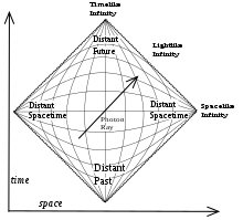در نسبیت عام هیچ جسم مادی نمیتواند به سرعت نور برسد یا از آن پیشی بگیرد. از طرفی هیچ تأثیری از رویداد A نمیتواند به هیچ مکان X دیگری برسد، مگر آنکه قبلاً نوری از A به X رفته باشد. در نتیجه این امر، بررسی جهانخطهای نور (ژئودزیکهای پوچ) اطلاعات کلیدی را در مورد ساختار سببی فضازمان در اختیارمان قرار میدهد. این ساختار را با نمودارهای پنروز–کارتر نمایش میدهند که در آن نواحی بینهایت بزرگ و بازههای زمانی بینهایت فشرده میشوند تا در یک نقشه متناهی جای گیرند. اما نور همانند نمودارهای استاندارد فضازمان، در راستای قطرها حرکت میکند.[104]