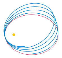 در نسبیت عام، نقطه حضیض هر مدار (یعنی نقطهای که در آن، جسم در حرکت مداری نزدیکترین فاصله را با گرانیگاه سامانه دارد) حرکتی تقدیمی خواهد داشت – همانطور که در شکل مشخص است، شکل مدار بیضی نیست بلکه شبیه به بیضی است که روی کانونش میچرخد و یک منحنی رز پدیدمیآورد –. اینشتین برای نخستین بار این نتیجه را با استفاده از یک متریک تقریبی بهعنوان نمایندهٔ حد نیوتنی و یک ذره آزمون بهعنوان جسم در حرکت مداری استنتاج نمود. برای او دانستن این واقعیت که نظریهاش توضیح مستقیمی دربارهٔ حرکت تقدیمی حضیض خورشیدی سیاره تیر – که در سال ۱۸۵۹ توسط اوربن لاوریه کشف شده بود – ارائه میکند، گواه مهمی بود بر اینکه او شکل درستی از معادلات میدان گرانشی را یافتهاست.[57]