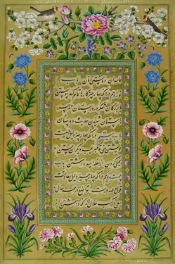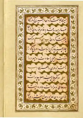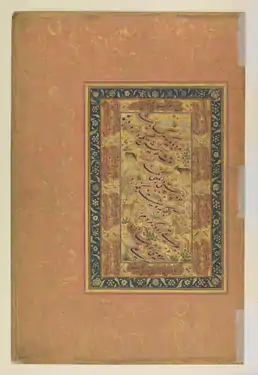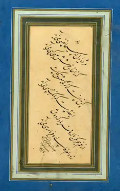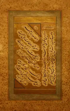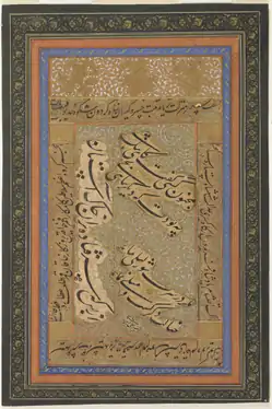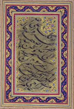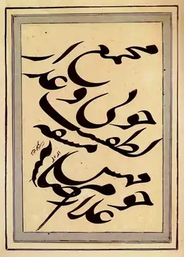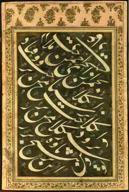 نستعلیق در مسیرِ تکاملش بهدست سلطانعلی مشهدی قوی شد و به حرکت آمد؛ میر علی هِرَوی و مالک دِیْلَمی و باباشاه اصفهانی و محمدحسین تبریزی آن را نضج دادند و میرعماد آن را به کمال رساند. در نیمهٔ نخست حکومت صفوی که عصر درخشانی در هنر ایرانی و خوشنویسی بود، نستعلیق نیز به کمال خویش رسید.[35] نستعلیق مهمترین خط از میان قلمهای هشتگانهٔ این دوران است. این خط، قلمِ مناسب و مطلوبِ نسخههای نفیسِ آثارِ ادب فارسیِ مصوّر و قطعاتِ خوشنویسیِ گردآمده در مرقّعات بود. در این دوره، خوشنویسان در ارتقای کیفیتِ کارشان با بهرهگیری از کاغذهای مرغوب — که بیشتر دارای رنگآمیزیهای درخشان و آهارمُهره و زرافشانی بودند — و نیز مرّکبهای رنگین همراه با ترکیبهای ماهرانه و حاشیههایی آراسته و تزیینشده کوشیدند.[36] بسیاری از خوشنویسان از دربارِ صفوی به دربارِ گورکانیان هند یا عثمانی رفتند و خطّ نستعلیق را در آن سرزمینها رواج دادند و نستعلیق از آنجا به بسیاری از کشورهای اسلامی راه پیدا کرد؛ بهویژه در شبهقارهٔ هند نستعلیق به خط مورد علاقهٔ گورکانیانِ هند تبدیل شد.[37][38] در اواخر سدهٔ نهم هجری قمری بود که نستعلیق به استانبول، پایتخت عثمانی رسید و بهعنوان قلمی فرعی پرورش یافت و بهاشتباه «تعلیق» خوانده شد. در شبهقاره هم، نستعلیق در جایگاهِ نوعی خطّ محلی قرار گرفت و گردشهای قلمش در حالتِ افقی ضخیمتر شد که با نگارش زبان اُردو تناسب داشت.[39]