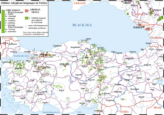 تنها در سال ۱۸۶۴ حدود ۲۲۰٬۰۰۰ نفر در آناتولی از کشتی پیاده شدند. بین ۶ مارس و ۲۱ مه ۱۸۶۴، تمام اوبیخها از قفقاز به ترکیه عزیمت کردند و در آنجا از نظر زبانی از بین رفتند. با پایان این عملیات، بیش از ۴۰۰۰۰۰ چرکس، ۲۰۰٬۰۰۰ آبخاز و آجار به ترکیه گریختند. اصطلاح Çerkes، «چرکسها»، مدتها در ترکیه برای تمامی آنها استفاده میشد زیرا که اکثریت آدیغه بودند. برخی دیگر از پناهجویان چرکس به مناطق مرزی ولایت طونه گریختند. عثمانیها در این مناطق، نیروهای نظامی خود را برای دفاع از استان جدید افزایش داده بودند. برخی از چرکسها وارد خدمت نطامی شدند و برخی دیگر در این منطقه مستقر شدند.[125]