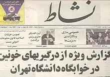 ![]() شماره ۲۰ تیر ۱۳۷۸ روزنامه نشاط با تیتری درباره حمله به کوی دانشگاه تهران (۱۸ تیر ۱۳۷۸) | |