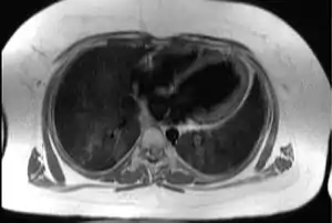 | دید بالایی-پایینی از سینهٔ انسان در محل قرارگیری قلب که بافت چربیِ تحتجلدی و اپیکاردیال (سفیدرنگ) را در بیمار مبتلا به «سندرم آلستروم» نشان میدهد و در نتیجه میتوان دریافت که چرا انجام اکوکاردیوگرافی قلب در این بیماران مشکل است. | |