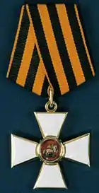 صلیب: یک صلیب مینا سفید رنگ با یک نشان مرکزی که تصویر سنت جورج را روی اسب سوار اژدها میکند. این صلیب در مورد کلاس اول سفارش ۶۰ میلیمتر است و در رنگهای سنت جورج (نارنجی و سیاه) بر روی لکه پوشیده شدهاست. همان صلیب ۶۰ میلیمتر در اطراف گردن روی نوار ۴۵ میلیمتر عرض و همچنین در رنگهای سنت جورج برای کلاس دوم نشان پوشیده شدهاست. این صلیب برای کلاس سوم سفارش ۵۰ میلیمتر است و همچنین در اطراف گردن پوشیده میشود اما از نوار ۲۴ میلیمتر عرض در همان رنگها استفاده میشود. کلاس چهارم نشان یک صلیب ۴۰ میلیمتری است که از سینه سمت چپ آویزان شدهاست از یک تخته پنج ضلعی پوشیده از روبان ۲۴ میلیمتر از سنت جورج.[8]