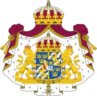 | نگهدارها | لاجوردی، چهارخانه شده توسط صلیب، و شامل سپر دودمان شاهی. درزمینههای نخست و چهارم، ۳ تاج باز، یا به عبارتی دیگر، دو تاج بالای یک تاج قرار دارند. در زمینههای دوم و سوم سه شیر تاج دار با زبان و چنگال سرخ دیده میشود. در میان آرم خاندان واسا (Vasa) و خاندان برنادوته (Bernadotte) دیده میشود. سپر اصلی نشان تاج سلطنتی تاج گذاری شدهاست و این خود نشان رسته سلطنتی سرافیم است. |
