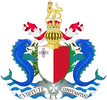 | نگهدارها | Dexter, An olive branch; sinister, a palm branch in vert all in their proper colours, tied at base with a ribbon argent, backed gules and upon which is written in capital letters sable the name of the country in the زبان مالتی. |