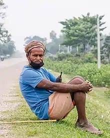 مردی نشسته بر روی زمین در جاده ای در نپال