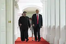 - در مارس ۲۰۱۸ رهبر کره شمالی در یک چرخش ناگهانی از رئیسجمهوری آمریکا برای دیدار مستقیم دعوت کرد، و ترامپ نیز از آن استقبال کرد.[14]