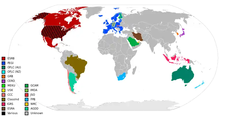 در تصویر زیر کشورهایی که از معیارهای مختلف ردهبندی سنی بازیهای رایانهای استفاده میکنند نشان داده شدهاست. کشورهای که با هاشور نشان داده شده اند از چندین معیار مختلف استفاده میکنند.
