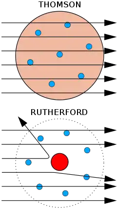 بعد از آن نظریههایی توسط جوزف جان تامسون طی آزمایشهایی بر روی پرتو کاتدی که به نظریه کیک کشمشی یا هندوانهای مشهور است، منتشر شد. بر طبق مدل تامسون: