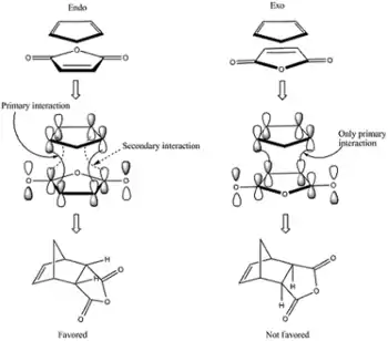 در مسیر انجام یک واکنش دیلز-آلدر مواد اولیه میتوانند به دو صورت اِندو یا اِگزو به یکدیگر نزدیک شده و موجب ایجاد پیوند و تشکیل محصول شوند. مسیر اِگزو دارای پوشیدگی فضایی و همپوشانی اوربیتالی بیشتر و مسیر اضافه شدن اِندو، پوشیدگی فضایی و همپوشانی اوربیتالی کمتری است. محصول اِگزو به لحاظ گرمایی پایدارتر و محصول اِندو به لحاظ تشکیل سریعتر است. در نتیجه، محصول اِگزو یک محصول ترمودینامیکی و محصول اِندو یک محصول سینتیکی است. با کمک نظریه اوربیتال مولکولی مرزی میتوان به بررسی اوربیتالهای درگیر در این دو نوع روش نزدیک شدن مواد اولیه به یکدیگر پرداخت و نوع محصول نهایی و مجاز بودن/نبودن آن از لحاظ همپوشانی اوربیتالی را پیشبینی کرد.