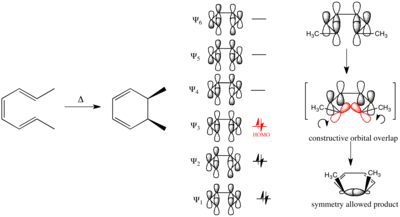 یک مثال مناسب از واکنشهای حلقهزایی واکنش دیلز-آلدر است. واکنش میان یک مالئیک انیدرید و یک سیکلوپنتادیان الگوی خوبی برای یک واکنش دیلز-آلدر است. واکنش میان این دو مولکول براساس قوانین وودوارد-هافمن مجاز است (مطابق این قانون: اگر تعداد کل الکترونهای پای درگیر در فرایند واکنش زوج باشد اکنش در شرایط گرمایی مجاز است). نظریه اوربیتال مولکولی نیز مجاز بودن این واکنش را بهمانند قوانین وودوارد-هافمن تایید میکند و حتی شیمی فضایی محصولات را هم پیشبینی میکند، موضوعی قوانین وودوارد-هافمن از انجام آن ناتوان هستند.