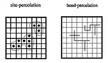 البته همین سؤالات را میتوان برای هر ابعادی از شبکه مطرح کرد. همانطور که واضح است، بررسی یک شبکه نامحدود نسبت به یک شبکه با ابعاد بزرگ سادهتر است. در این حالت سؤال بالا به این صورت در میآید: آیا خوشهٔ بازبینهایت وجود دارد؟ یا به عبارتی آیا در میان رأسهای متصل به هم مسیری به طول بینهایت در داخل شبکه وجود دارد؟ با توجه به قانون کولموگوروف،[* 1] برای هر p داده شده، احتمال اینکه چنین خوشهای وجود داشته باشد یا یک است یا صفر. از آنجایی که این احتمال تابعی صعودی از p است، یک نقطهٔ بحرانی از p وجود دارد (که با pc نشان داده میشود) که قبل از این نقطه به احتمال ۰ و بعد از آن به احتمال ۱ چنین مسیری وجود خواهد داشت. در عمل این تغییر فاز بحرانی به راحتی قابل مشاهده است. حتی اگر n به مانند ۱۰۰ کوچک هم باشد، احتمال اینکه مسیری از بالا به سطح پایینی وجود داشته باشد در بازهای نزدیک به pc از نزدیکیهای صفر تا نزدیکیهای یک به شدت افزایش مییابد.