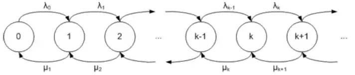 شکل 1. روند تولد / مرگ. مقادیر موجود در دایرهها نشاندهنده وضعیت فرایند تولد مرگ برای k فرایند است. انتقال سیستم بین k فرایندها توسط "تولد" و "مرگ" است که به ترتیب با نرخ دادهشده توسط مقادیر مختلف λi و μi رخ میدهد. برای یک سیستم صفبندی، k تعداد کارهای موجود در سیستم (در حال سرویسدهی یا در حال انتظار درصورتیکه صف دارای بافر برای کارهای در حال انتظار باشد) است. بعلاوه، برای یک صف، نرخ ورود و نرخ خروج معمولاً با توجه به تعداد کارهای موجود در صف در نظر گرفته نمیشود، بنابراین ما یک نرخ متوسط ورود و خروج در واحد زمان به صف را در نظر میگیریم. ازاینرو، برای یک صف، این نمودار دارای نرخ ورود λ = λ1 , λ2 , … , λk ، و نرخ خروج µ = µ 1 , µ 2 , … , µ k است (شکل 2 را ببینید).