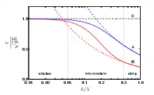 در وضعیت آب عمیق (با عمق بینهایت از نظر ریاضی) هنگامی که تراز بستر به بینهایت میل میکند (∞- → z)، سرعت جریان باید به سوی صفر میل کند.