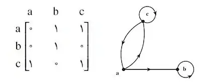 پس میتوان این ماتریس را متناظر با رابطه مقابل در نظر گرفت. توجه کنید که درایههای ij ام ماتریس مساوی با ۱ است اگر و تنها اگر iRj.