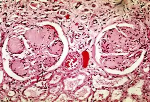 | Photomicrography of nodular glomerulosclerosis in Kimmelsteil–Wilson syndrome. Source: CDC | |