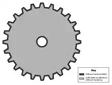در فرایند سخت کاری سطحی، روی سطح قطعات مختلف فلزی (معمولاً استیل) با با نفوذ کربن سخت میکنند در حالی که مغز قطعه، همان مادهٔ اولیه است و سخت نشده است و نرم است. در شکل روبرو یک چرخ دنده را نشان میدهد که برش مقطعی خورده است و همانطور که مشاهده میشود، سطح خارجی و نزدیک آن سخت کاری شدهاست.[5] هم چنین شفتهای آهنی را از این طریق، سخت کاری میکنند. در زمانهای قدیم نیز از این روش استفاده میشده است. بدین صورت که با قرار دادن شمشیر گداخته در زغال و حرارت دادن آنها، کربن را در شمشیر نفوذ میدادند. شعلهای که ایجاد میشده، شعلهٔ احیایی بودهاست.
