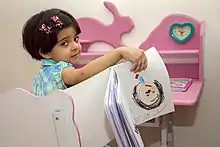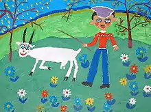 دختر بچه پنج ساله در حال نشان دادن نقاشی خود.- ۳-درتکنیک دیگری که به شیوهٔ نقاشیدرمانی میتوان اجرا کرد امکانات اولیه که در تمرینهای قبل نیز به بدانها اشاره شد، دراختیار گروه قرار میگیرد اما این بار «هنر درمانگر» با هدایت گروه به سمت سوژههای از قبل تعیین شده سعی دارد به ذهن آنان ساختاری بدهد. به عنوان نمونه با دست مایه قرار دادان سوژهای، بازگویی قصهای یا انجم یک گردش و ترسیم هر آنچه گروه دیدهاست در قالب یک نقاشی، این تکنیک اجرا میشود. در این شیوه هر کدام از اعضای گروه تلاشی برای تجسم بخشیدن به مکنونات ذهنی خود دارند؛ و در این مرحله است که نقش هنر درمانگر و تیم همراه، برای جهت دهی صحیح به کار گروه مشخص میشود. نقش درمانگر و مداخله آگاهانه او در فرایند خلافیت گروهی اساسیترین عنصر در کاهش آسیبهای روانی میان اعضای گروهاست. تحقیق [کاوه، محمدحسین و همکاران(۱۳۸۱)]،[15] درارتبـاط با نقـش مداخله گرانه معلمان در زمینه بهداشت روانی در مدارس ابتدایی نیز تأکیدی بر همین موضوع است ایشان همچنین محقق ساخت که:
