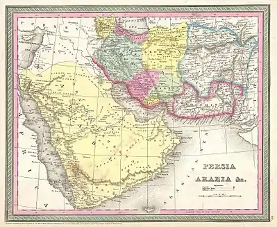 نقشه خاورمیانه ساموئل آگوستوس میشل نقشه قسمت عمدهای از خاورمیانه که شامل پرشیا (ایران)، شبه جزیره عربستان، کشور افغانستان، کشور بلوچستان و خلیج فارس (درنقشه Persian Gulf) میباشد. این نقشه به وسیله ساموئل آگوستوس میشل و در سال ۱۸۵۰ میلادی کشیده شدهاست. ولایتهای ایران نیز در آن دوران که خوزستان، مازندران و گیلان، آذربایجان، عراق عجم، فارس، لارستان، کرمان و خراسان بودهاند با رنگهای مجزا رسم شدهاند. در این نقشه رودهایی همانند کرخه، اترک و دیو رود (نام کنونی؟) و کوههایی مثل رشته کوه البرز و الوند نمایان هستند. بسیاری از شهرها نیز با نام به روز آن عصر (مثل گمبرون و سلطانیه به ترتیب بندرعباس و زنجان) در نقشه درج شدهاند.