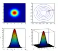 Example showing the relationships between a heat map, surface plot, and contour lines of the same data